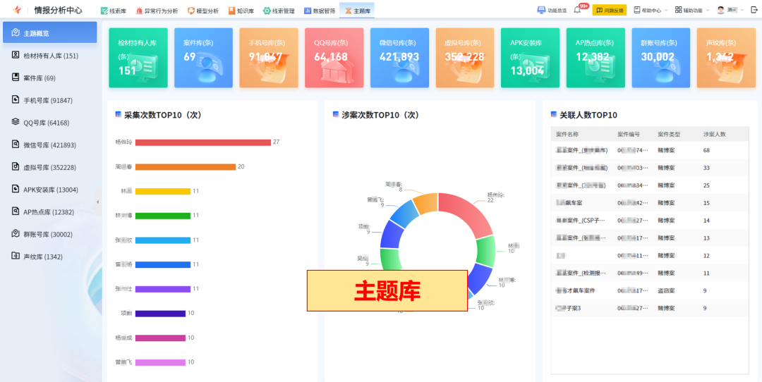 构建检材持有人、案事件、手机号、QQ/微信号、声纹等多维主题库,提炼实体线索信息,快速检索定位;
